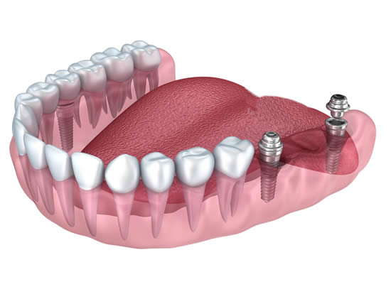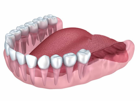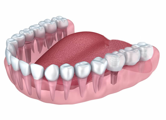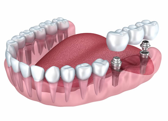 A dental implant is a titanium rod that is secured into the jaw-bone to provide a strong foundation for the placement of a dental crown. When complete, the implant and crown look and function just like a natural tooth enabling you to eat a full range of food and smile confidently again. Implants can be placed singly or in combination to replace several lost teeth.